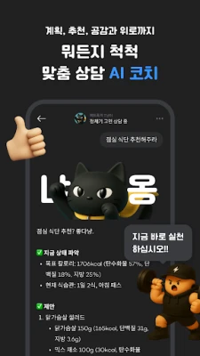 인아웃의 특별함은 여기서 그치지 않습니다. '인아웃 Plus'의 똑똑한 AI 코치, 말랑 AI가 당신의 다이어트를 한 단계 업그레이드합니다. 섭취량이나 운동 방법이 모호할 때도 AI가 알아서 계량하고 분석하여 기록하며, 당신의 데이터를 기반으로 개인 맞춤형 식단과 운동 루틴을 제안합니다. 매주 제공되는 AI 리포트는 기록을 심층 분석하여 개선 방향까지 제시해 주죠. 또한, 신체 정보에 맞춰 기초 대사량과 적정 섭취 칼로리, 목표 식단(키토, 비건 등)에 따른 탄단지 비율까지 설정할 수 있으며, 간헐적 단식 스케줄 관리 기능으로 단식 목표 달성도 돕습니다. 직관적인 그래프로 식사와 운동 패턴에 따른 몸의 변화를 한눈에 파악하며 건강한 습관을 만들어 보세요.