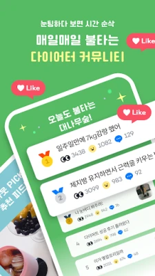 혼자 하는 다이어트가 지루하게 느껴진다면, 인아웃 커뮤니티에서 함께 목표를 향해 나아가세요. 나의 식단, 운동, 눈바디는 물론 다이어트 꿀팁까지 자유롭게 공유하고, 다른 사용자들의 기록을 보며 건강한 자극을 받을 수 있습니다. 더욱 흥미진진한 도전을 원한다면 '다이어트 배틀'에 참여해 보세요. 친구들과의 그룹 배틀부터 1:1 대결까지, 서로 응원하고 경쟁하며 목표 달성의 즐거움을 배가시킬 수 있습니다. 매일 주어지는 미션을 완료하고 '사과' 포인트를 모아 나만의 '마이룸'을 꾸미거나, 귀여운 스티커로 하루의 컨디션을 기록하는 소소한 재미까지. 마이노멀컴퍼니의 인아웃은 당신의 모든 건강 여정을 즐겁게 응원하며 함께합니다.