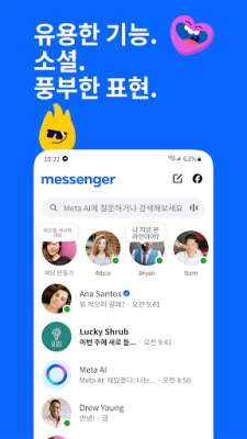 메신저는 단순한 메시지를 넘어 풍부한 경험을 선사합니다. 고해상도 사진으로 아름다운 추억을 선명하게 공유하고, 친구들과 함께하는 소중한 순간들을 공유 앨범으로 만들어 오랫동안 간직하세요. 워드, PDF, 엑셀 등 최대 100MB에 달하는 대용량 파일도 채팅창에서 바로 전송하여 업무와 일상에 필요한 모든 것을 해결할 수 있습니다. 궁금한 점에 즉각 답하고 조언을 제공하는 똑똑한 메타 AI는 이미지 생성, 수정, 애니메이션화 등 창의적인 작업까지 돕는 당신의 스마트한 동반자가 되어줍니다. 새로운 사람과의 연결도 손쉽습니다. 실제 만난 인연과는 QR 코드를 스캔하거나 링크를 공유하여 바로 소통을 시작할 수 있습니다.