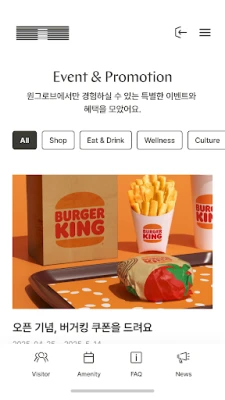원그로브는 입주사 임직원뿐만 아니라 모든 방문객에게도 스마트한 경험을 제공합니다. 원그로브 몰의 입점 매장 정보와 다채로운 프로모션을 실시간으로 확인하고, 단지를 찾아오시는 길 안내부터 자주 묻는 질문(FAQ), 그리고 1:1 문의까지 모든 궁금증을 한곳에서 해결할 수 있습니다. 원그로브는 이처럼 다채로운 정보를 한데 모아, 방문객 모두에게 최상의 편의를 선사하는 통합 플랫폼 역할을 수행합니다.