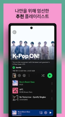 Spotify는 1억 개 이상의 다채로운 노래와 6백만 개가 넘는 흥미로운 팟캐스트로 가득 찬 광대한 오디오 세계로 여러분을 초대합니다. 아티스트가 직접 큐레이션한 독점 플레이리스트부터 개인의 취향에 꼭 맞는 맞춤형 추천곡까지, 쉽고 빠르게 좋아하는 음악과 프로그램을 찾아 몰입감 넘치는 청취 경험을 즐겨보세요. 음악 애호가와 팟캐스트 팬 모두를 위한 궁극의 오디오 동반자가 여기 있습니다.
